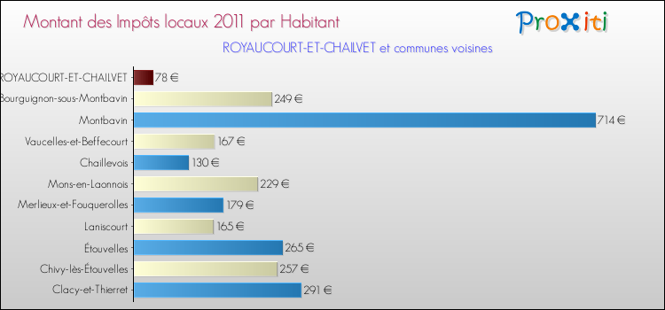 A noter : la valeur moyenne des impôts locaux dans les communes françaises similaires à Royaucourt-et-Chailvet était de 238 € par habitant, en 2011.