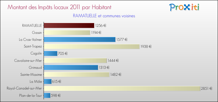 A noter : la valeur moyenne des impôts locaux dans les communes françaises similaires à Ramatuelle était de 725 € par habitant, en 2011.