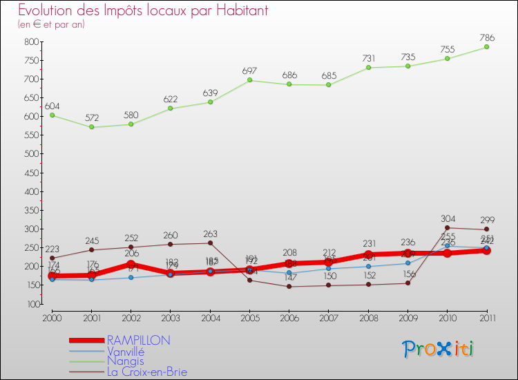 A Rampillon, les impôts locaux par habitant ont donc augmentés de 39.08 % entre 2000 et 2011.