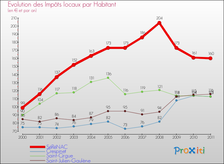 A Sérénac, les impôts locaux par habitant ont donc augmentés de 61.62 % entre 2000 et 2011.