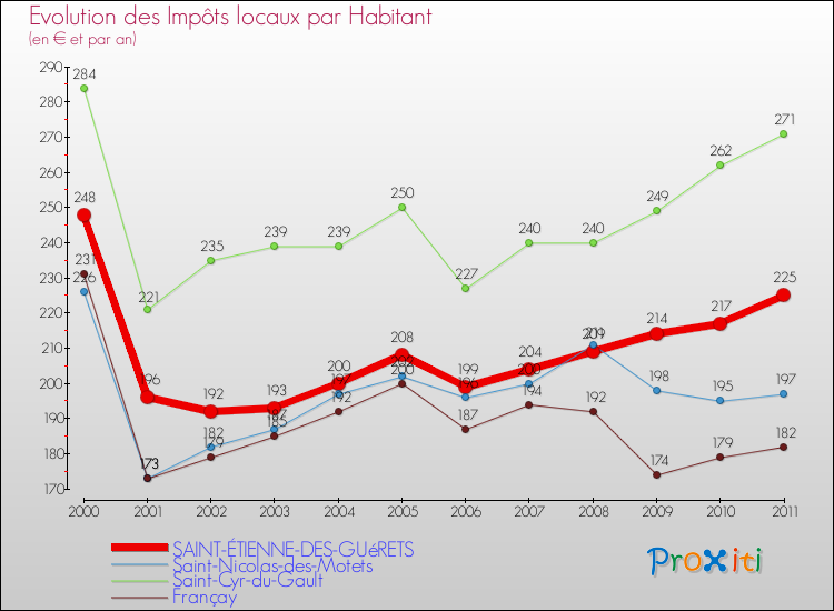 Pendant la même période, les communes françaises similaires à Saint-Étienne-des-Guérets, ont vu leurs impôts locaux par habitant augmenter de 17.07 % en moyenne entre 2000 et 2011.