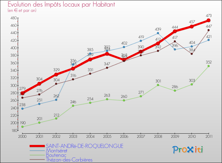 A Saint-André-de-Roquelongue, les impôts locaux par habitant ont donc augmentés de 69.53 % entre 2000 et 2011.