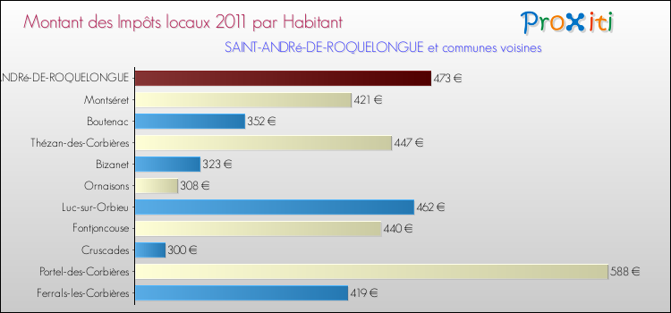 A noter : la valeur moyenne des impôts locaux dans les communes françaises similaires à Saint-André-de-Roquelongue était de 269 € par habitant, en 2011.