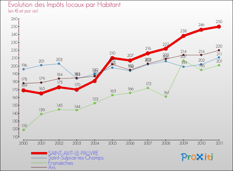 A Saint-Avit-le-Pauvre, les impôts locaux par habitant ont donc augmentés de 47.93 % entre 2000 et 2011.
