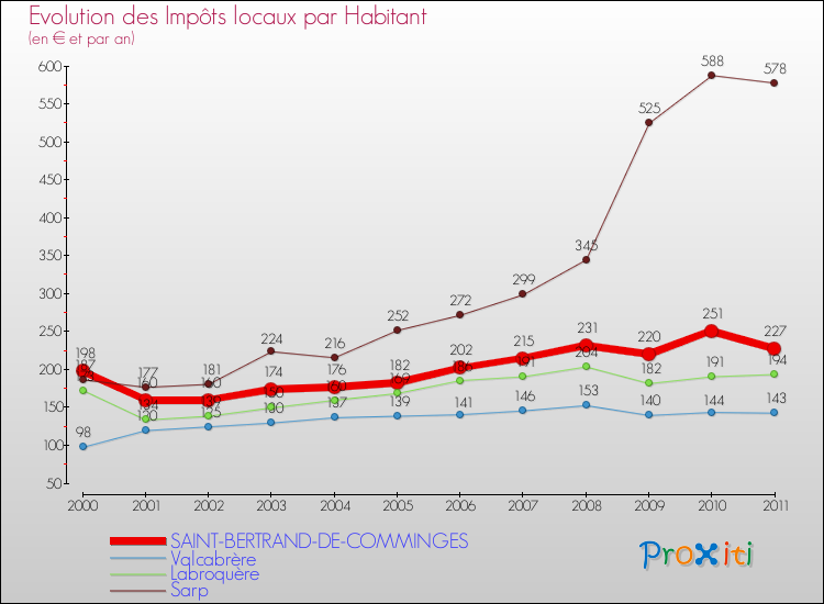 A Saint-Bertrand-de-Comminges, les impôts locaux par habitant ont donc augmentés de 14.65 % entre 2000 et 2011.
