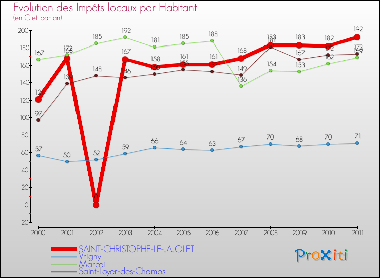Pendant la même période, les communes françaises similaires à Saint-Christophe-le-Jajolet, ont vu leurs impôts locaux par habitant augmenter de 21.21 % en moyenne entre 2000 et 2011.