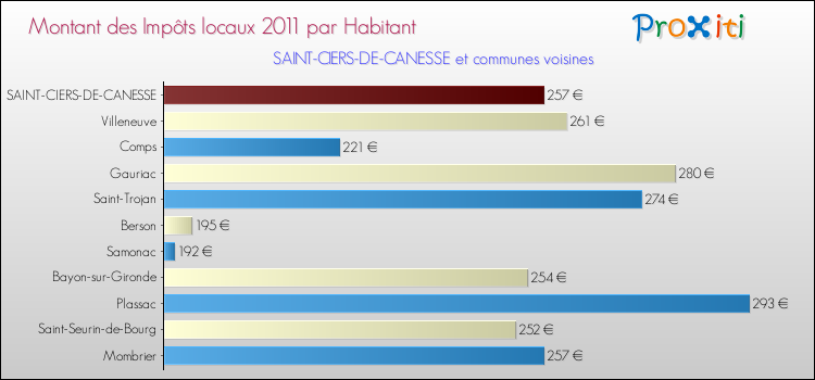 A noter : la valeur moyenne des impôts locaux dans les communes françaises similaires à Saint-Ciers-de-Canesse était de 269 € par habitant, en 2011.