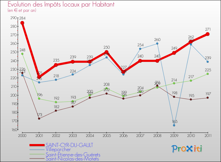 Pendant la même période, les communes françaises similaires à Saint-Cyr-du-Gault, ont vu leurs impôts locaux par habitant augmenter de 17.07 % en moyenne entre 2000 et 2011.