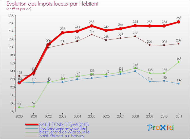 A Saint-Denis-des-Monts, les impôts locaux par habitant ont donc augmentés de 136.94 % entre 2000 et 2011.