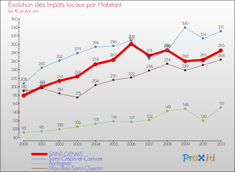A Saint-Geniès, les impôts locaux par habitant ont donc augmentés de 59.22 % entre 2000 et 2011.