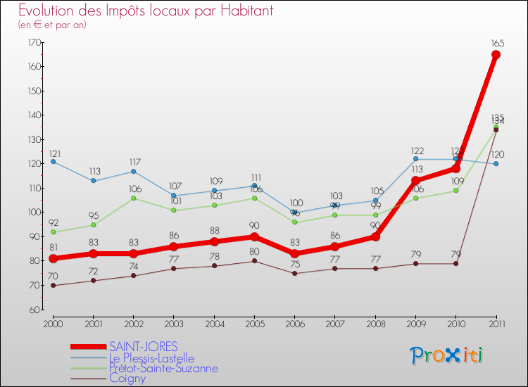 A Saint-Jores, les impôts locaux par habitant ont donc augmentés de 103.7 % entre 2000 et 2011.