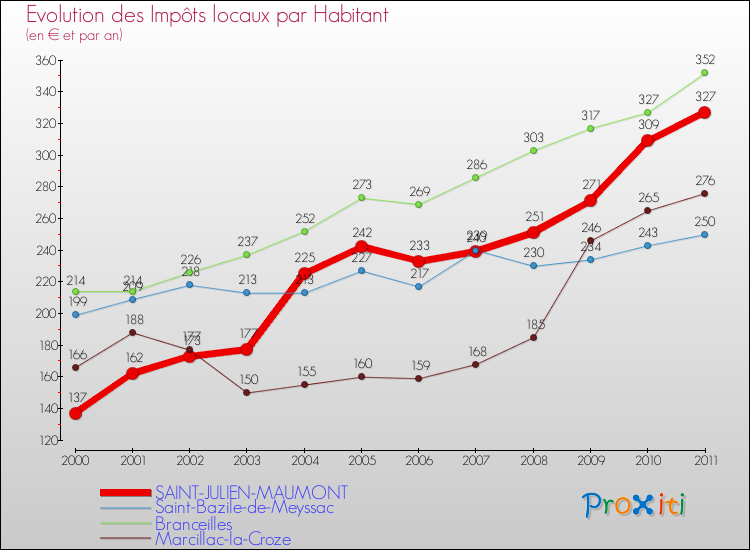 A Saint-Julien-Maumont, les impôts locaux par habitant ont donc augmentés de 138.69 % entre 2000 et 2011.