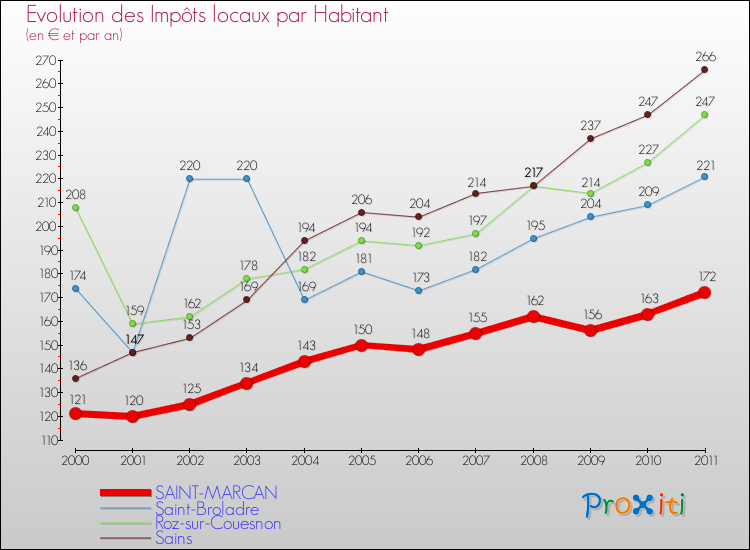 A Saint-Marcan, les impôts locaux par habitant ont donc augmentés de 42.15 % entre 2000 et 2011.