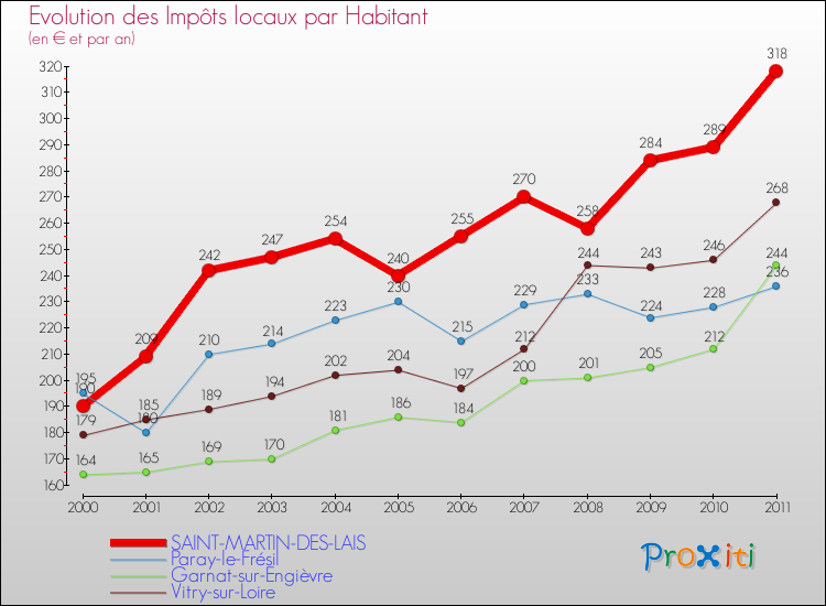 A Saint-Martin-des-Lais, les impôts locaux par habitant ont donc augmentés de 67.37 % entre 2000 et 2011.