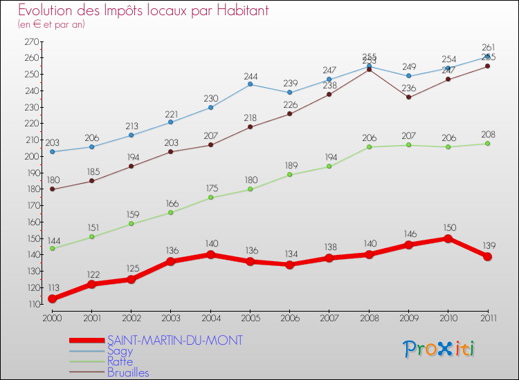 A Saint-Martin-du-Mont, les impôts locaux par habitant ont donc augmentés de 23.01 % entre 2000 et 2011.
