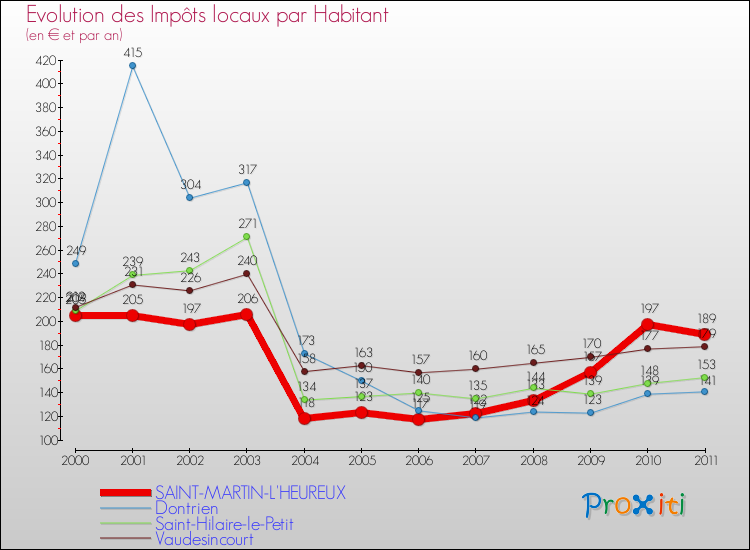 Le graphique ci dessous représente l'évolution des impôts locaux par habitant à Saint-Martin-l'Heureux depuis 2000.