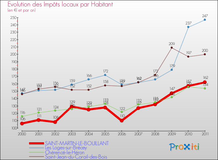 A Saint-Martin-le-Bouillant, les impôts locaux par habitant ont donc augmentés de 52.83 % entre 2000 et 2011.