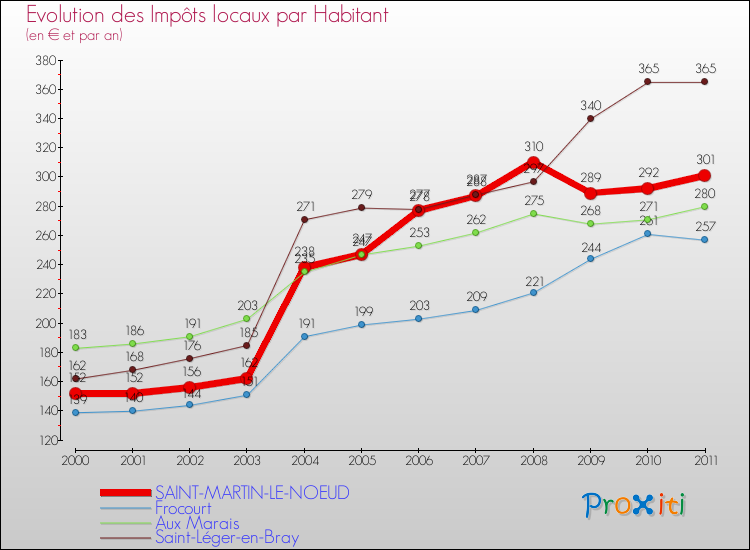 A Saint-Martin-le-Noeud, les impôts locaux par habitant ont donc augmentés de 98.03 % entre 2000 et 2011.