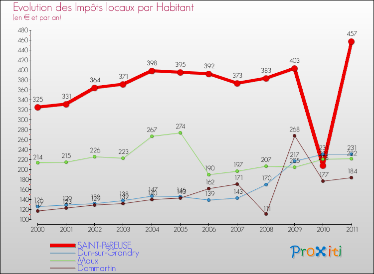 A Saint-Péreuse, les impôts locaux par habitant ont donc augmentés de 40.62 % entre 2000 et 2011.