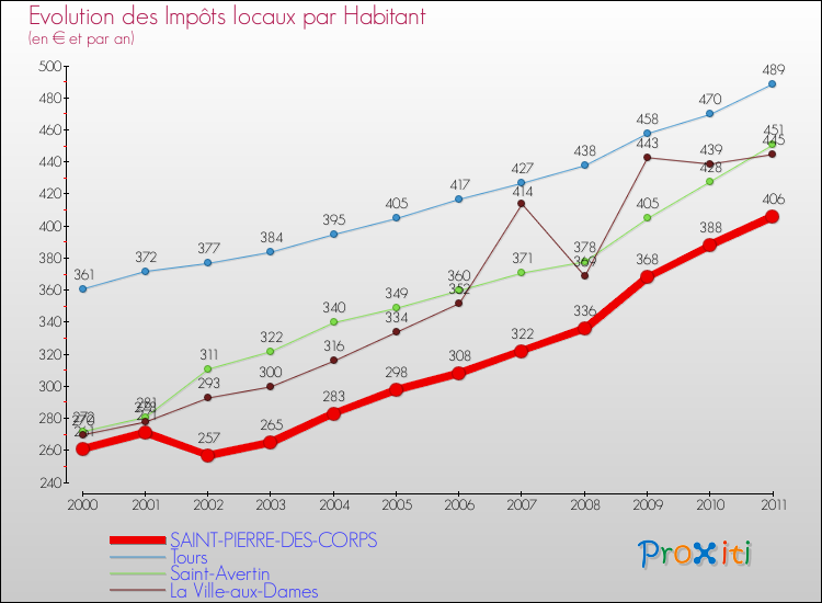 A Saint-Pierre-des-Corps, les impôts locaux par habitant ont donc augmentés de 55.56 % entre 2000 et 2011.
