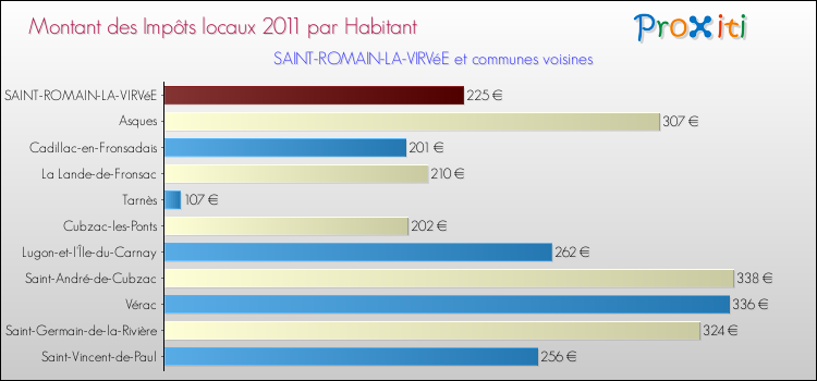 A noter : la valeur moyenne des impôts locaux dans les communes françaises similaires à Saint-Romain-la-Virvée était de 269 € par habitant, en 2011.