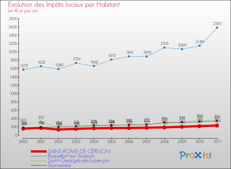 A Saint-Rome-de-Cernon, les impôts locaux par habitant ont donc augmentés de 50 % entre 2000 et 2011.