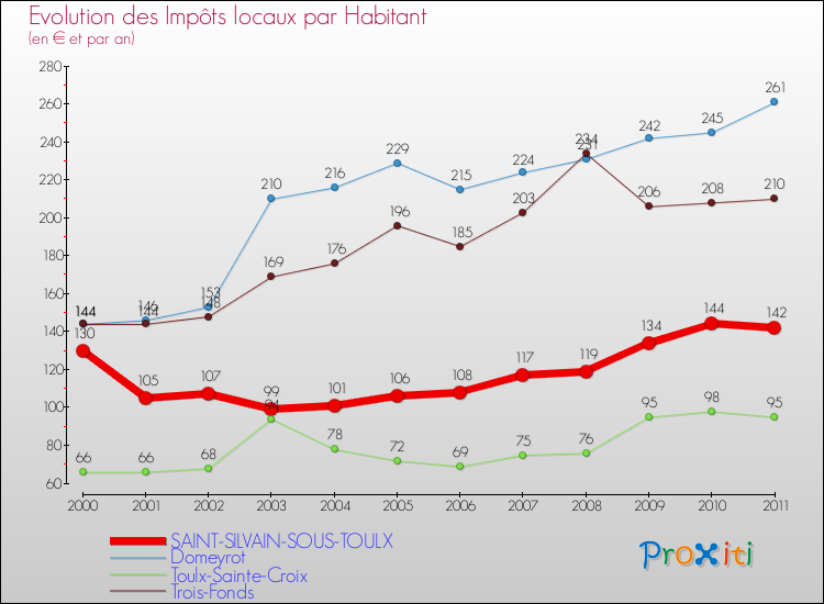 Pendant la même période, les communes françaises similaires à Saint-Silvain-sous-Toulx, ont vu leurs impôts locaux par habitant augmenter de 54.84 % en moyenne entre 2000 et 2011.
