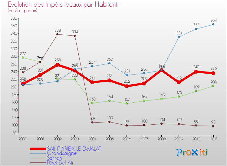 A Saint-Yrieix-le-Déjalat, les impôts locaux par habitant ont donc augmentés de 13.46 % entre 2000 et 2011.