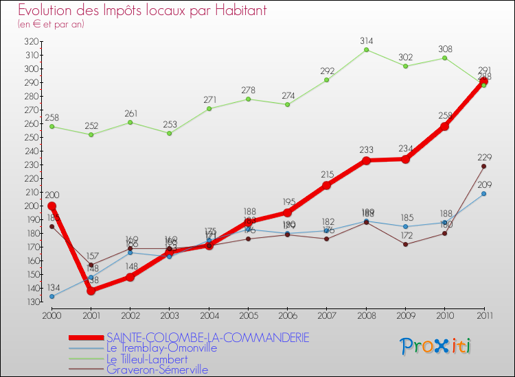 A Sainte-Colombe-la-Commanderie, les impôts locaux par habitant ont donc augmentés de 45.5 % entre 2000 et 2011.