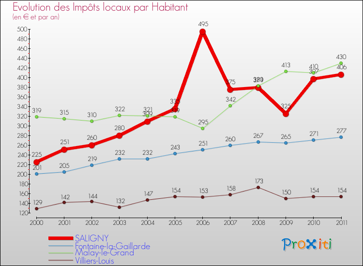 A Saligny, les impôts locaux par habitant ont donc augmentés de 80.44 % entre 2000 et 2011.