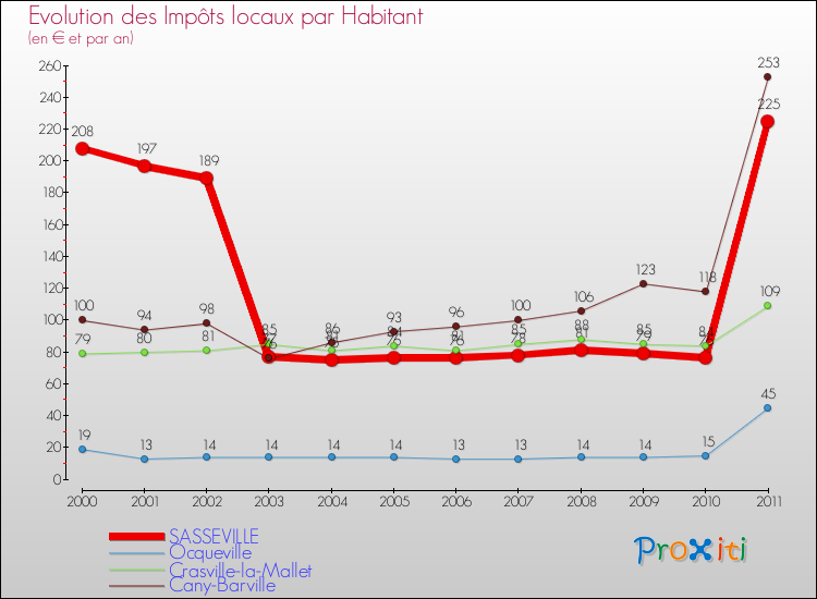A noter : la valeur moyenne des impôts locaux dans les communes françaises similaires à Sasseville était de 264 € par habitant, en 2011.