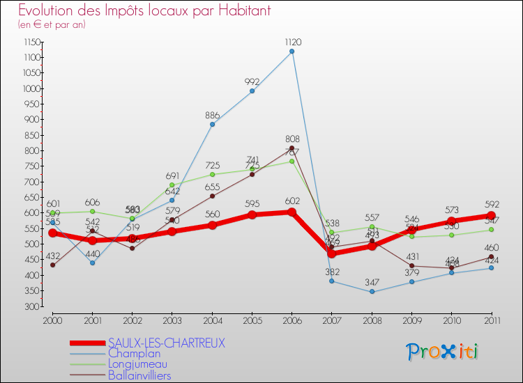 A Saulx-les-Chartreux, les impôts locaux par habitant ont donc augmentés de 10.65 % entre 2000 et 2011.