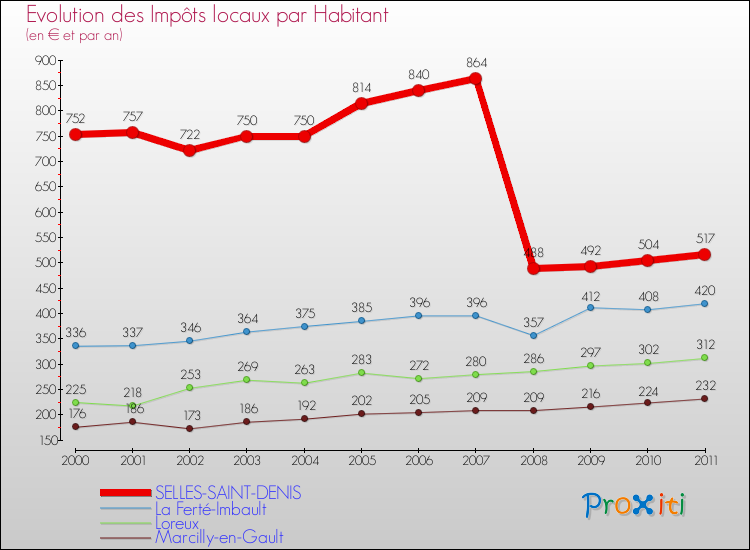 A Selles-Saint-Denis, les impôts locaux par habitant ont donc baissés de 31.25 % entre 2000 et 2011.
