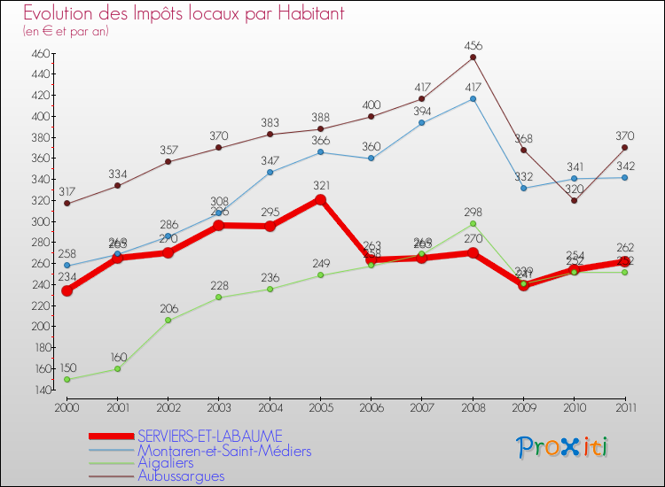 A noter : la valeur moyenne des impôts locaux dans les communes françaises similaires à Serviers-et-Labaume était de 269 € par habitant, en 2011.