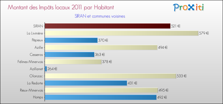A Siran, les impôts locaux par habitant sont donc plus élevés de 56.46 % que pour des communes similaires.