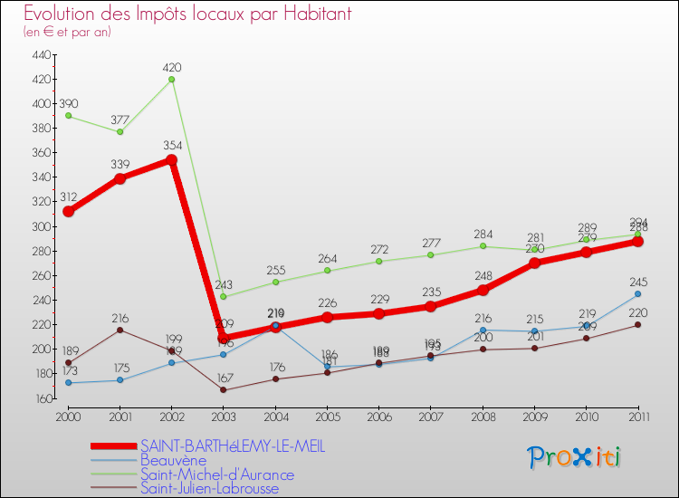 Pendant la même période, les communes françaises similaires à Saint-Barthélemy-le-Meil, ont vu leurs impôts locaux par habitant augmenter de 17.07 % en moyenne entre 2000 et 2011.