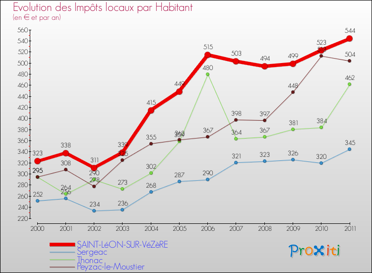 Pendant la même période, les communes françaises similaires à Saint-Léon-sur-Vézère, ont vu leurs impôts locaux par habitant augmenter de 20 % en moyenne entre 2000 et 2011.