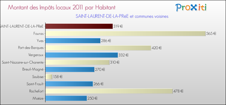 A noter : la valeur moyenne des impôts locaux dans les communes françaises similaires à Saint-Laurent-de-la-Prée était de 269 € par habitant, en 2011.