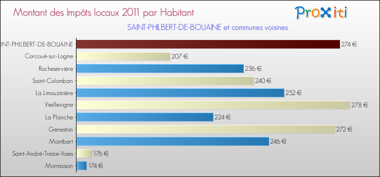 A noter : la valeur moyenne des impôts locaux dans les communes françaises similaires à Saint-Philbert-de-Bouaine était de 334 € par habitant, en 2011.