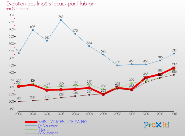 A Saint-Vincent-de-Salers, les impôts locaux par habitant ont donc augmentés de 42.11 % entre 2000 et 2011.