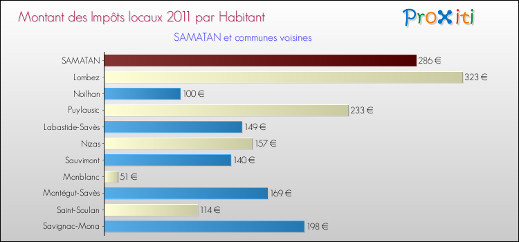 Pendant la même période, les communes françaises similaires à Samatan, ont vu leurs impôts locaux par habitant augmenter de 22.22 % en moyenne entre 2000 et 2011.