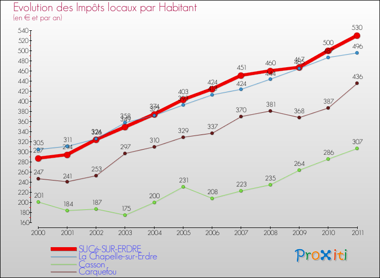 Pendant la même période, les communes françaises similaires à Sucé-sur-Erdre, ont vu leurs impôts locaux par habitant augmenter de 12.77 % en moyenne entre 2000 et 2011.