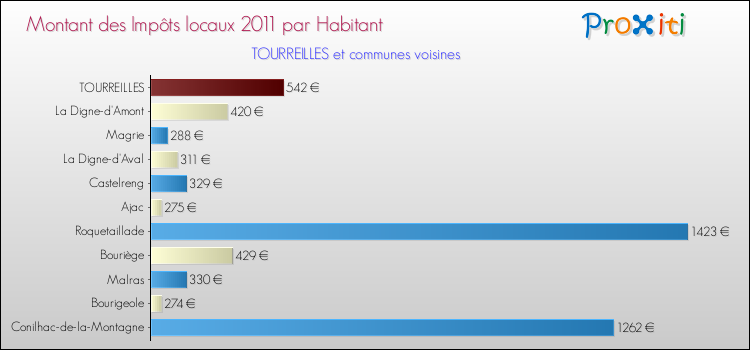 A Tourreilles, les impôts locaux par habitant sont donc plus élevés de 125.83 % que pour des communes similaires.