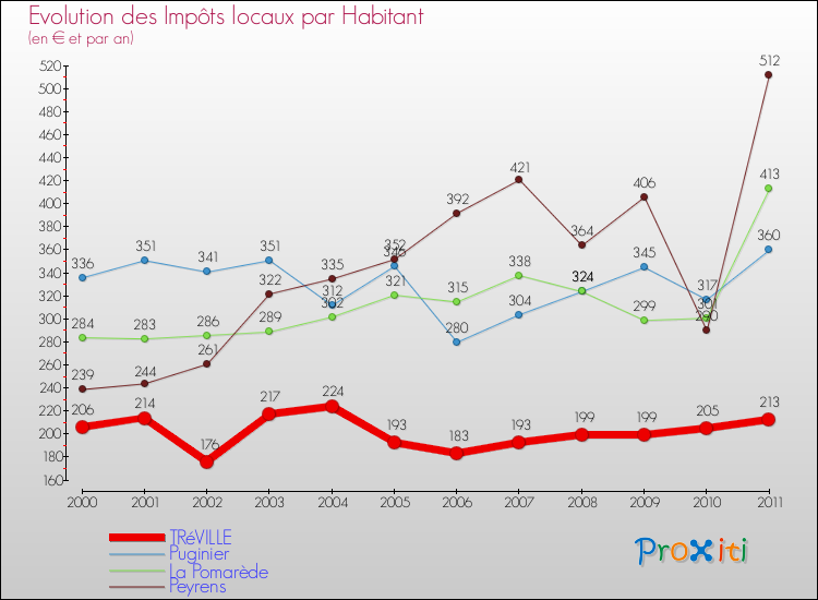 A Tréville, les impôts locaux par habitant ont donc augmentés de 3.4 % entre 2000 et 2011.