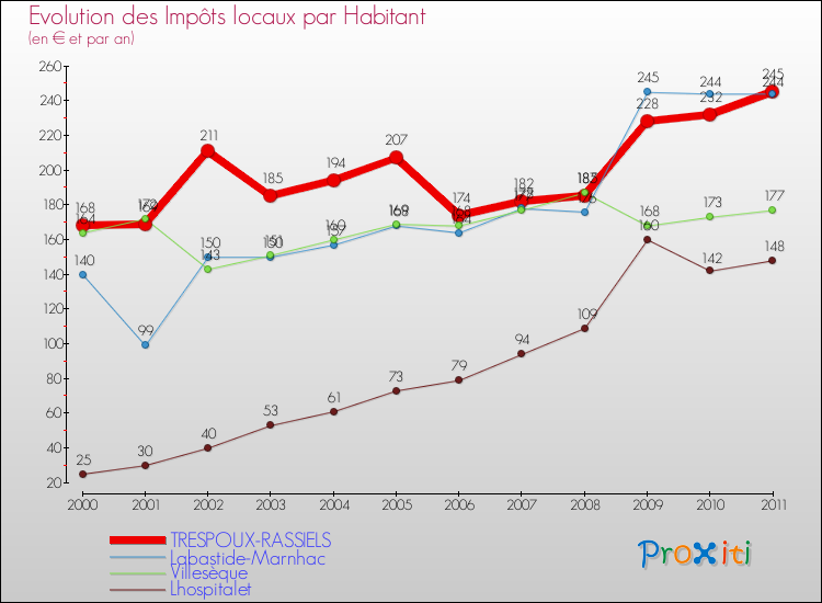 A Trespoux-Rassiels, les impôts locaux par habitant ont donc augmentés de 45.83 % entre 2000 et 2011.