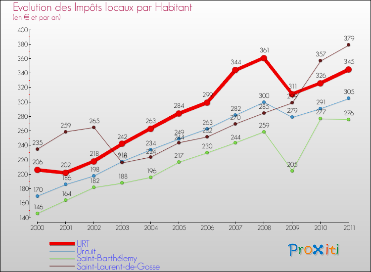 A Urt, les impôts locaux par habitant ont donc augmentés de 67.48 % entre 2000 et 2011.