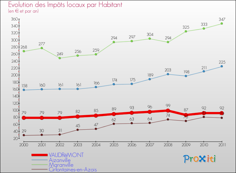 A Vaudrémont, les impôts locaux par habitant ont donc augmentés de 16.46 % entre 2000 et 2011.