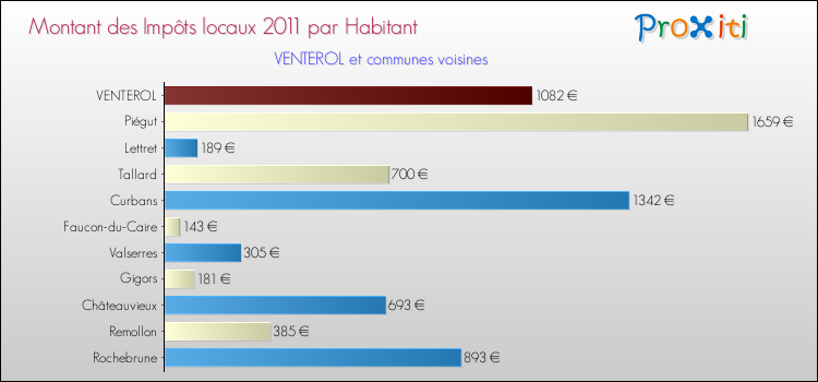A noter : la valeur moyenne des impôts locaux dans les communes françaises similaires à Venterol était de 238 € par habitant, en 2011.