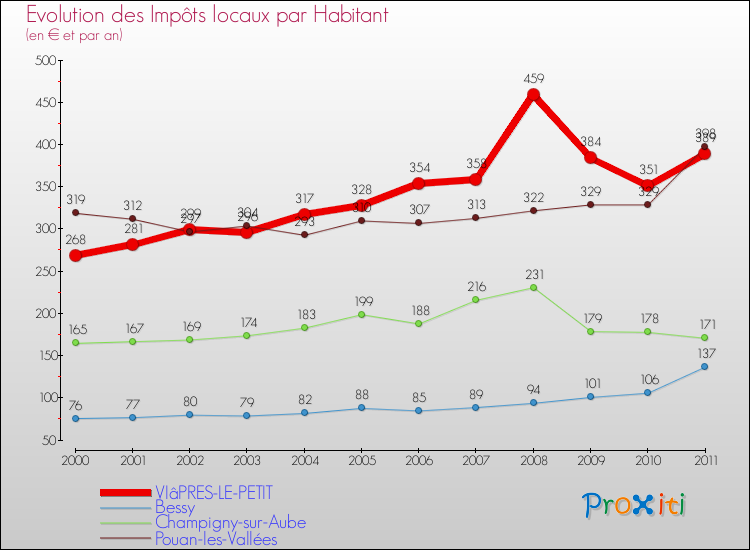 Pendant la même période, les communes françaises similaires à Viâpres-le-Petit, ont vu leurs impôts locaux par habitant augmenter de 88.29 % en moyenne entre 2000 et 2011.