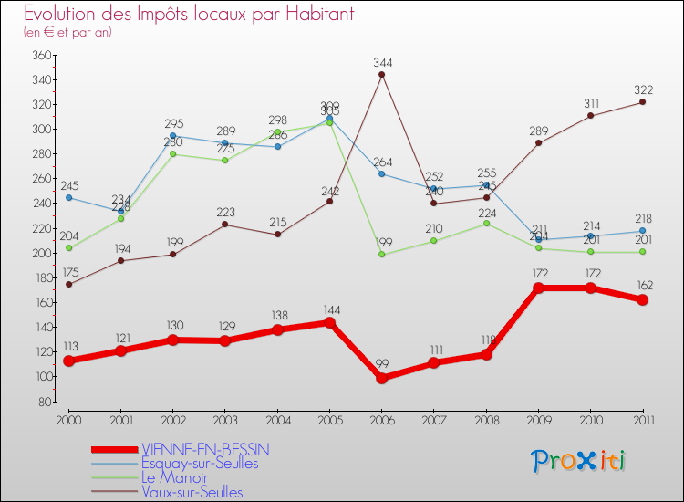 Pendant la même période, les communes françaises similaires à Vienne-en-Bessin, ont vu leurs impôts locaux par habitant augmenter de 14.15 % en moyenne entre 2000 et 2011.